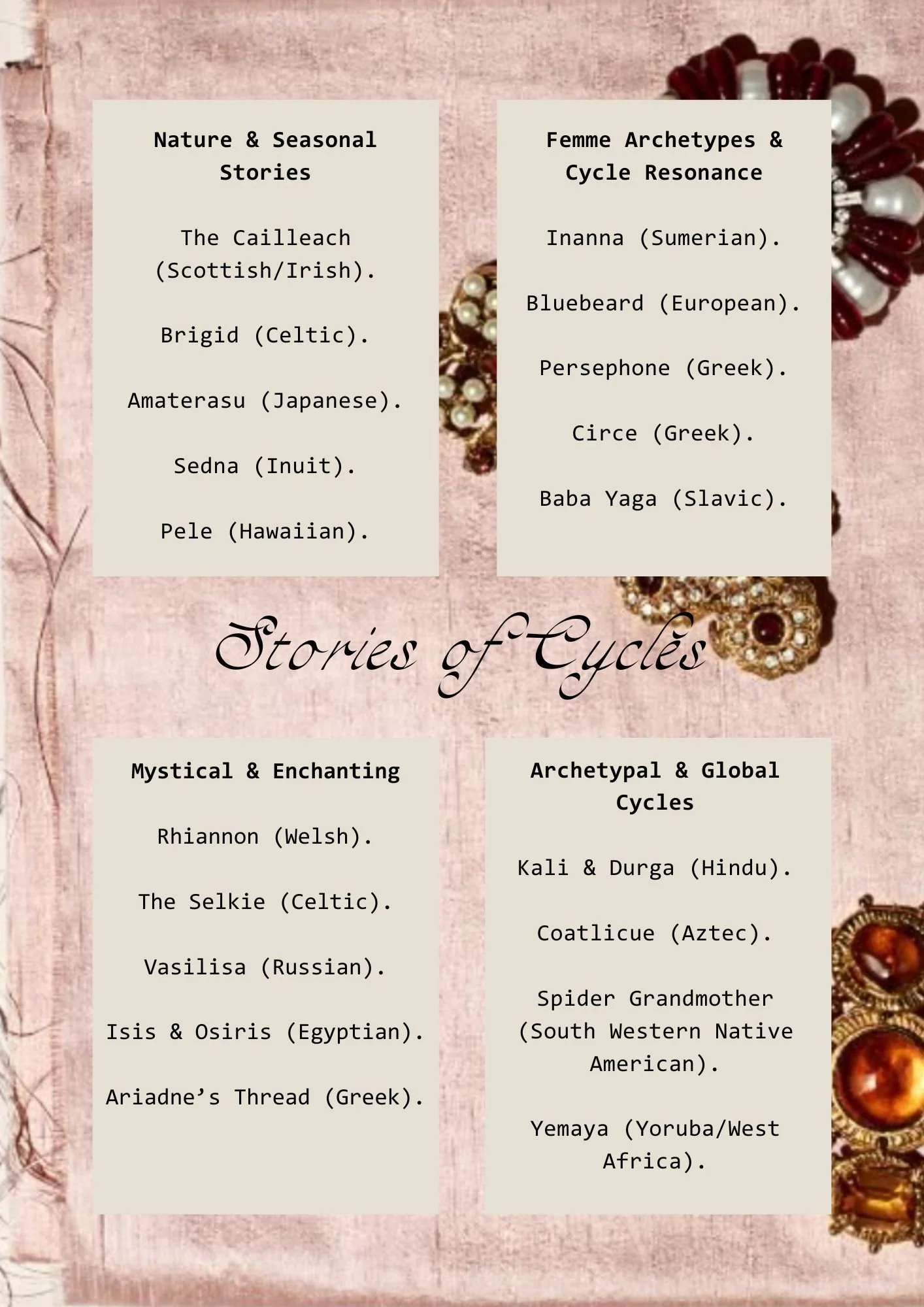 Use this free sample to connect with the many stories of cycles told through the world over time. You will find this in the Creative Attunement Workbook - your self-led, cyclical workbook designed to help you attune to your menstrual rhythm, reclaim your creative vitality, and live with greater presence, beauty, and inner coherence.
